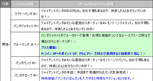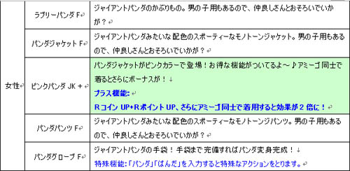 ジャケットやグローブのみのパーツアイテムでも特殊機能を持つ(「パンダ」と入力すると特殊アクションをとります)