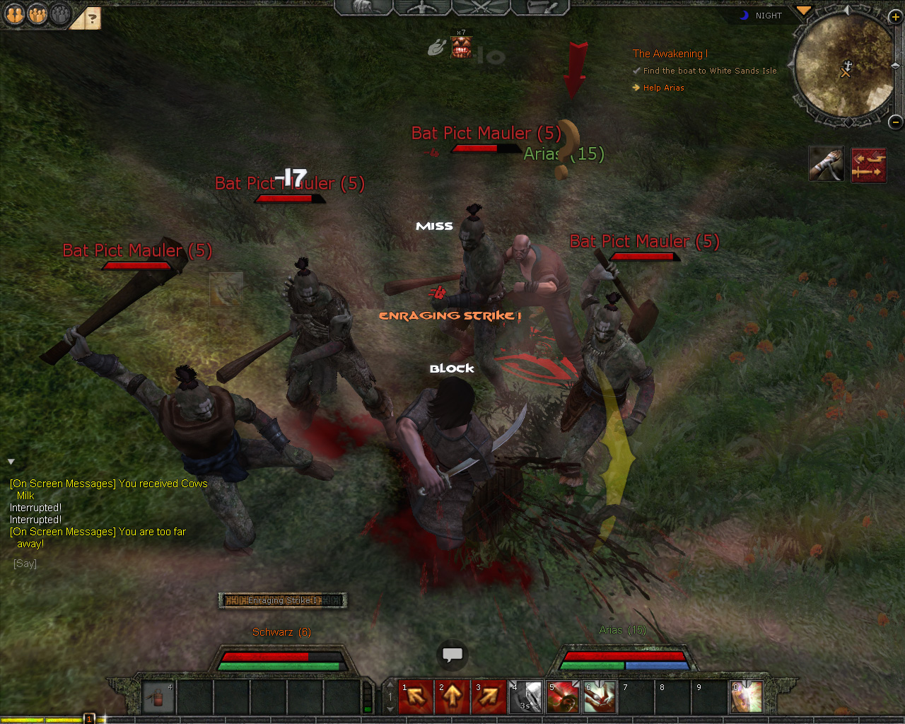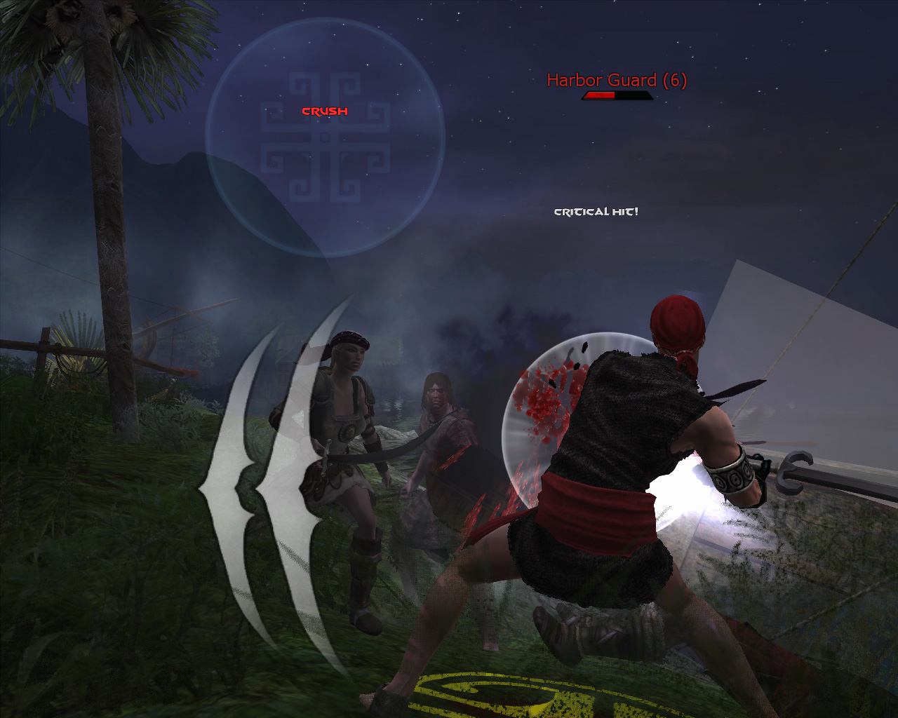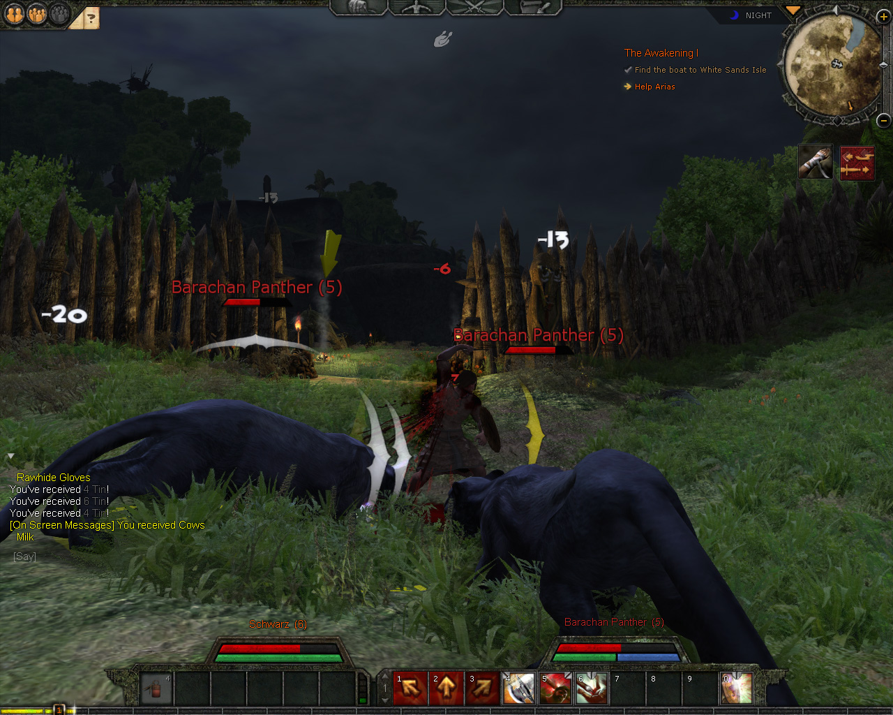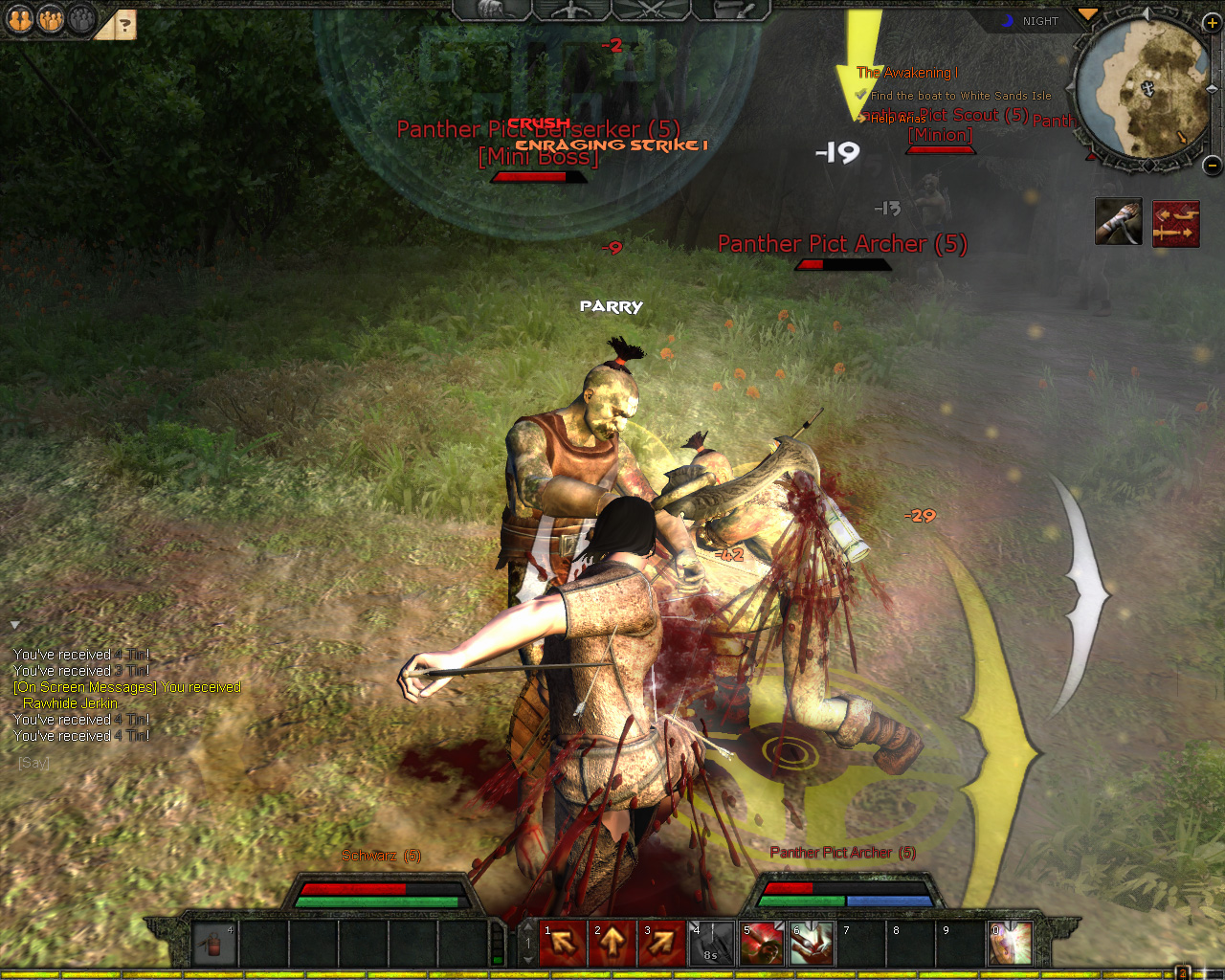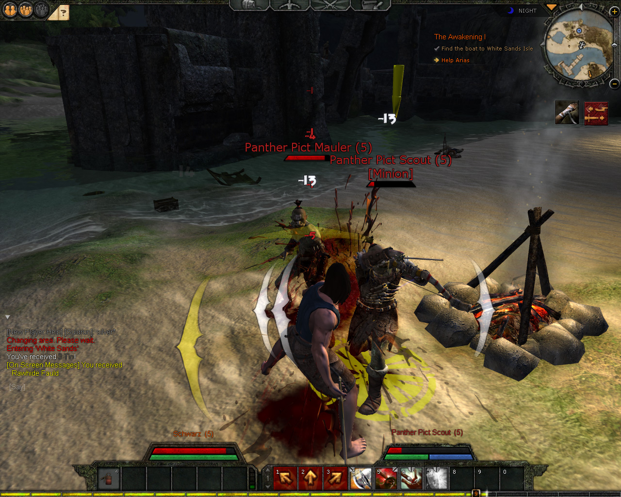 White Sands Isleは,広がる密林に蛮人のPictがうろうろしている物騒な場所だ。しかも,そこかしこに黒豹やらワニやらがうろつき,こちらを見かけるやいなや襲ってくる。島の中央あたりで多くのPictを相手に孤軍奮戦しているAriasを,なんとか助け出すことに成功した。途中にあるPictの村に殴りこんでやったら,たくさんの戦利品を見つけて装備をグレードアップできたのはラッキーだった。