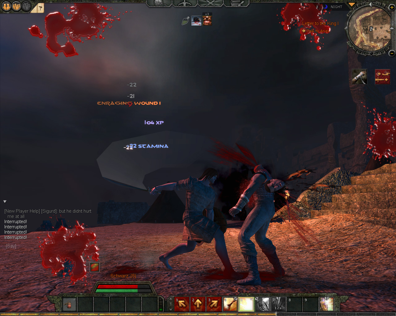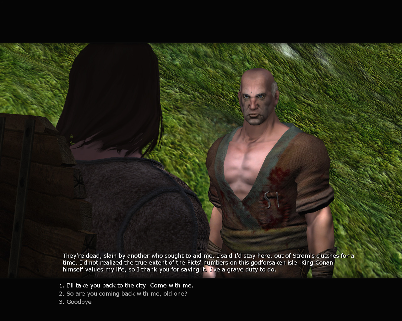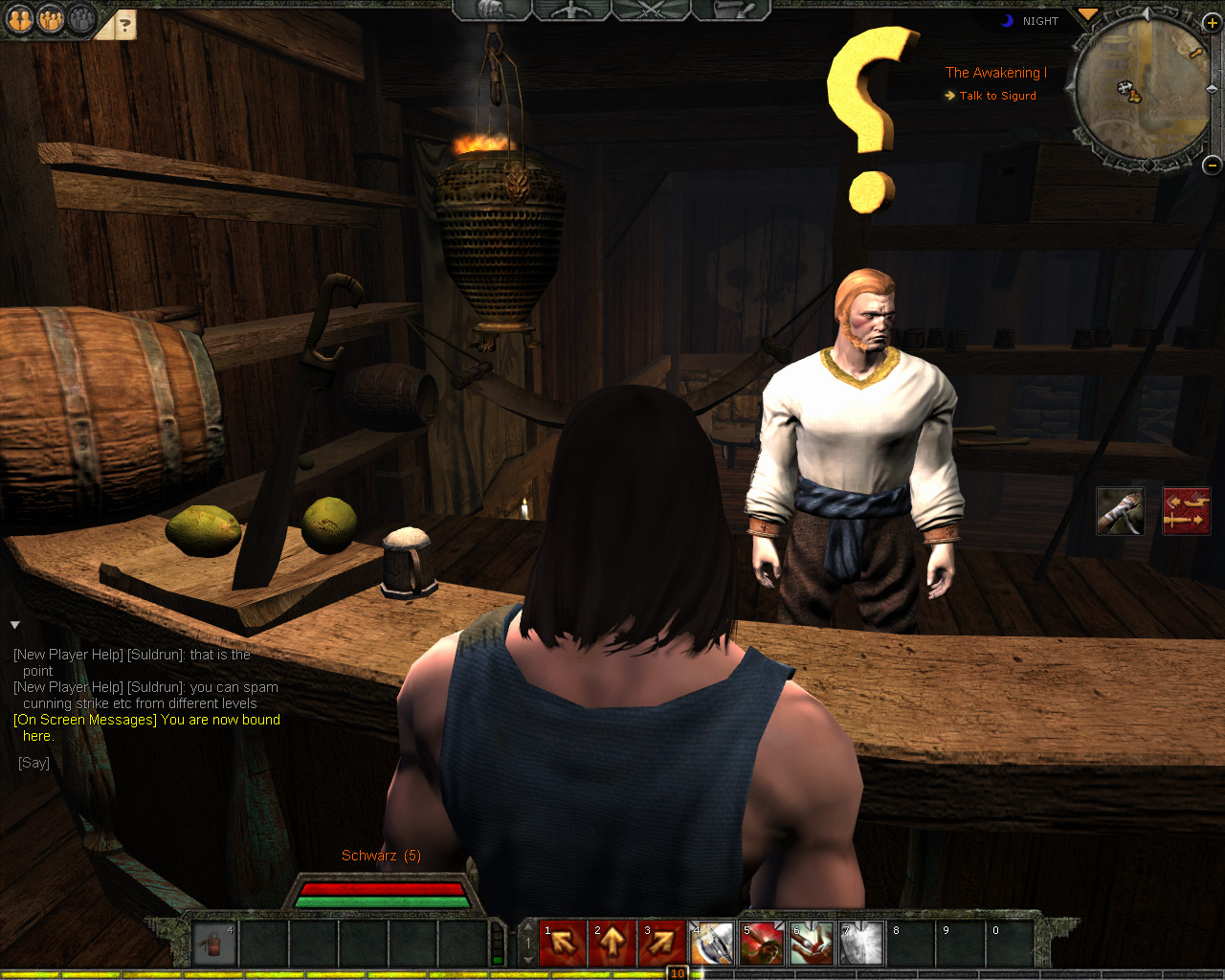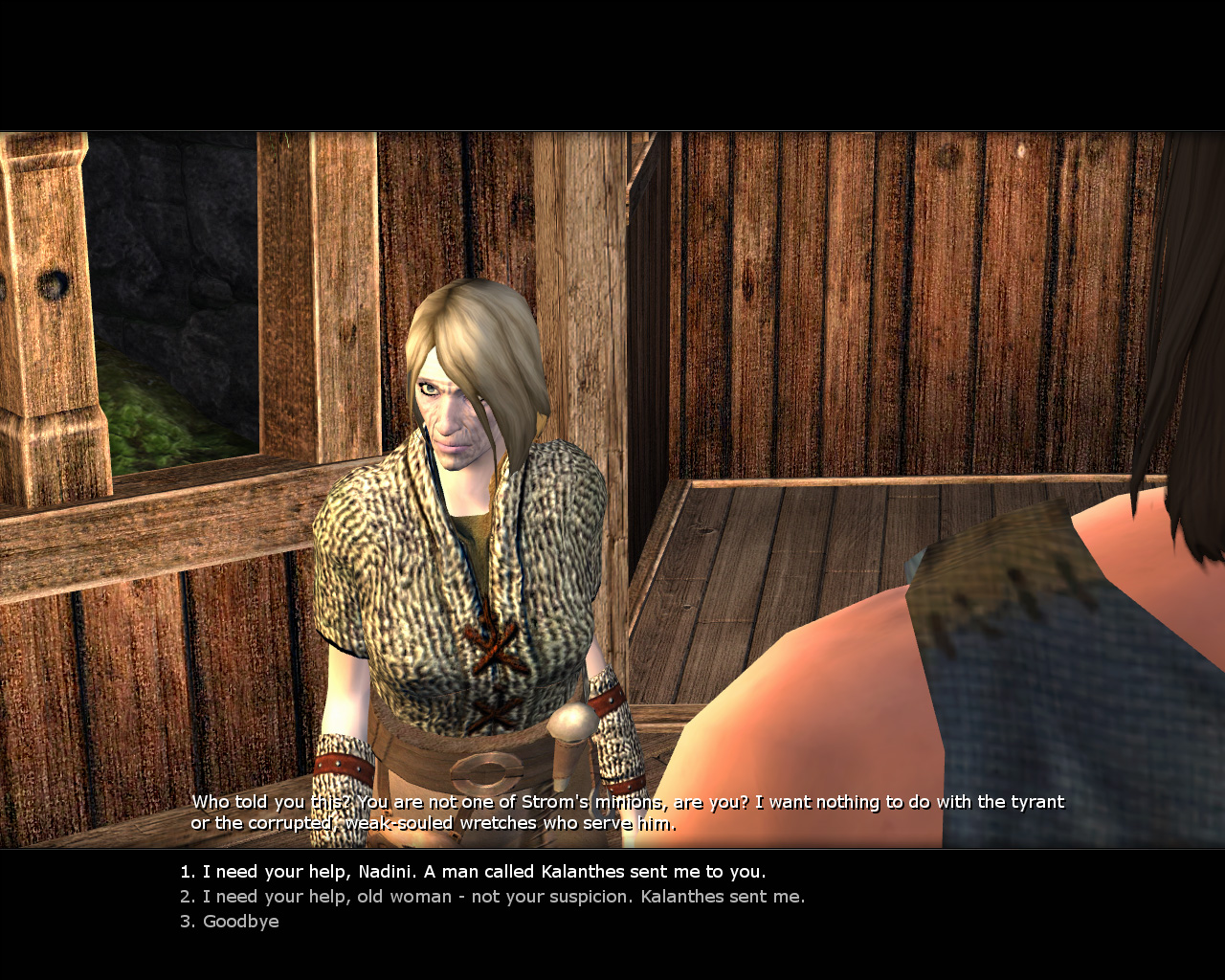Nadiniは,俺がStromの手下ではないことを一目で見抜くという,侮れない眼力をもったばあさんだった。俺の記憶と戦いの技術を取り戻すには,レジスタンスの一員であるSigurdの手伝いをしろという。そう,宿屋でカウンターにいたあのオヤジだ。その昔は海賊として鳴らし,あのコナン王とともに戦ったこともあるという古強者らしい。