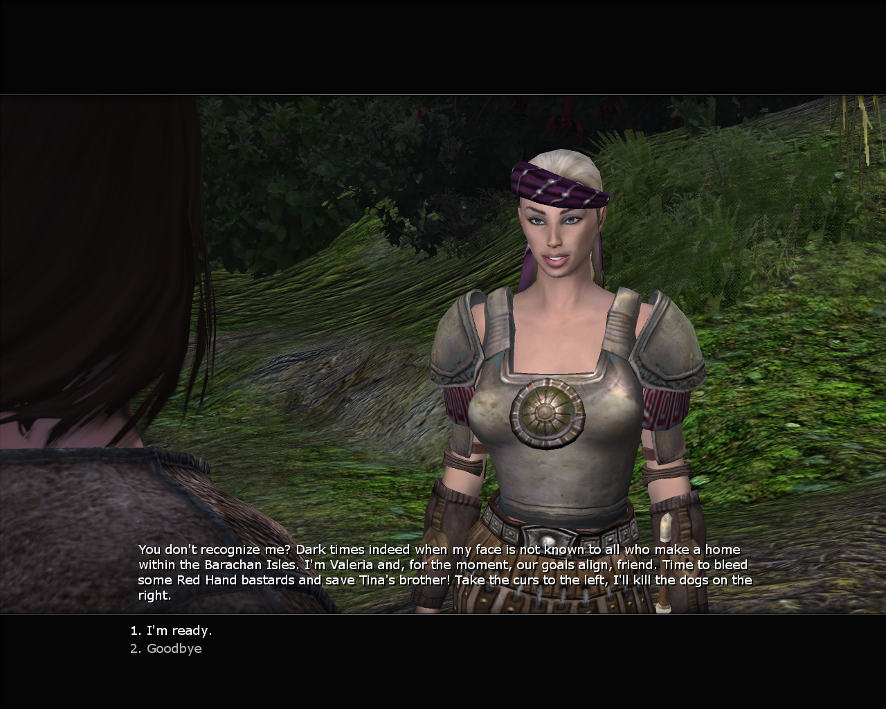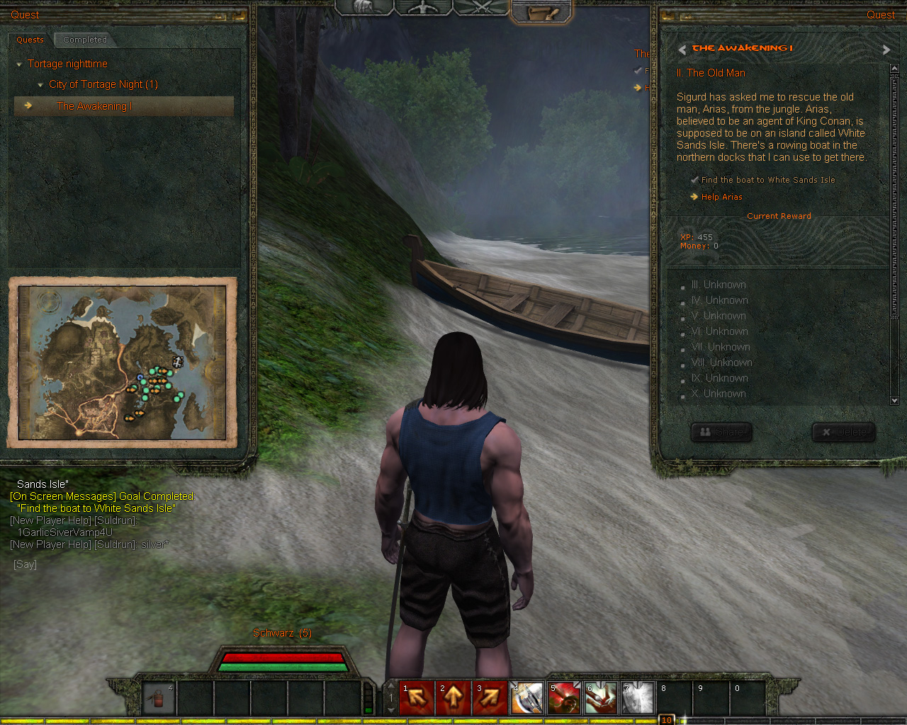 話してみるとSigurdは確かにヒトクセありそうなオヤジで,戦士としての記憶を取り戻すには戦うのが一番だなどと物騒なことをいって,レジスタンスの手助けをしているコナン王の密偵Ariasという男を助けに行くという仕事を振ってきた。AriasはRed HandsによってWhite Sands Isleという島に囚われ,今にも殺されてしまうらしい。ぐずぐずしてはいられない,すぐに行かねば!