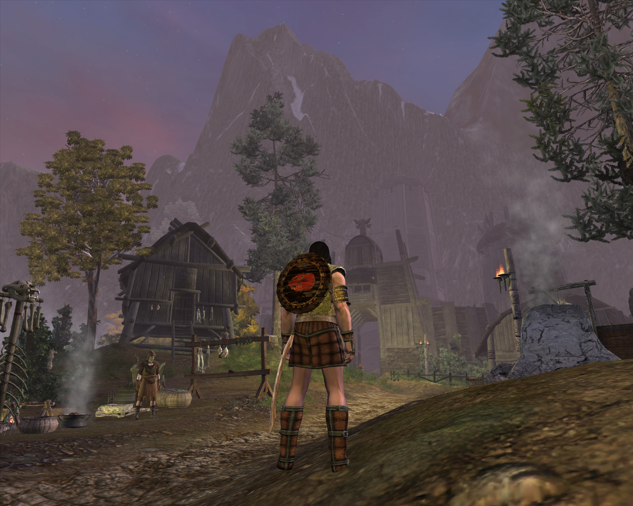 最初に訪れるConarch Villageは,これまた簡素な家(というか掘建て小屋)が寄り集まっている侘しい村だ。とはいえハイボリア北方地帯における中心地となっていることから,武器や防具,食料品などを売買する商人が常駐しており,キャラクターのフィートをリセットしてくれるTrainerや,オークションや手紙を管理するTraderなど一通りは揃っている。