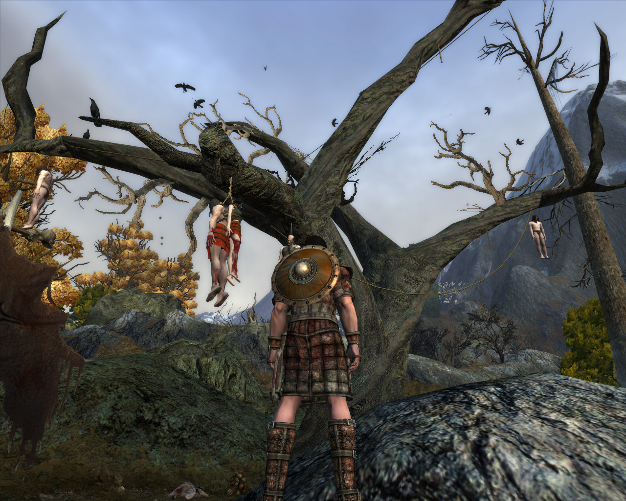 だがそれもまだよいほうで,村を一歩出るとまさに死体だらけという,さらなる惨状が拡がっている。しかも見せしめのために捕らえた捕虜を処刑したのだろう,串刺しにされた死体がずらりと並ぶという凄惨な光景は,数あるMMORPGの中でも,かなりショッキングなシーンだ。