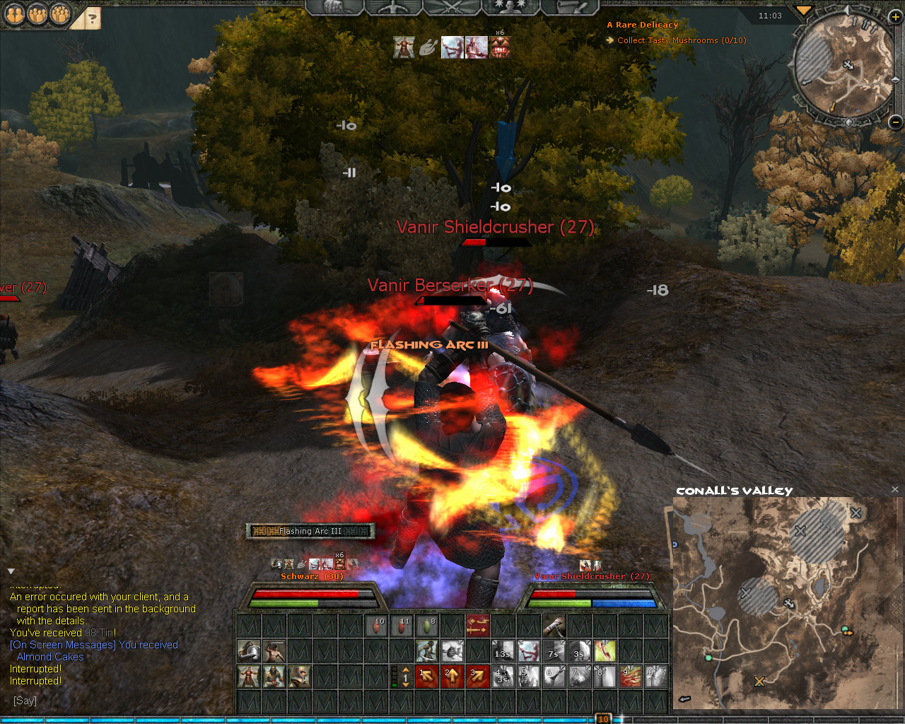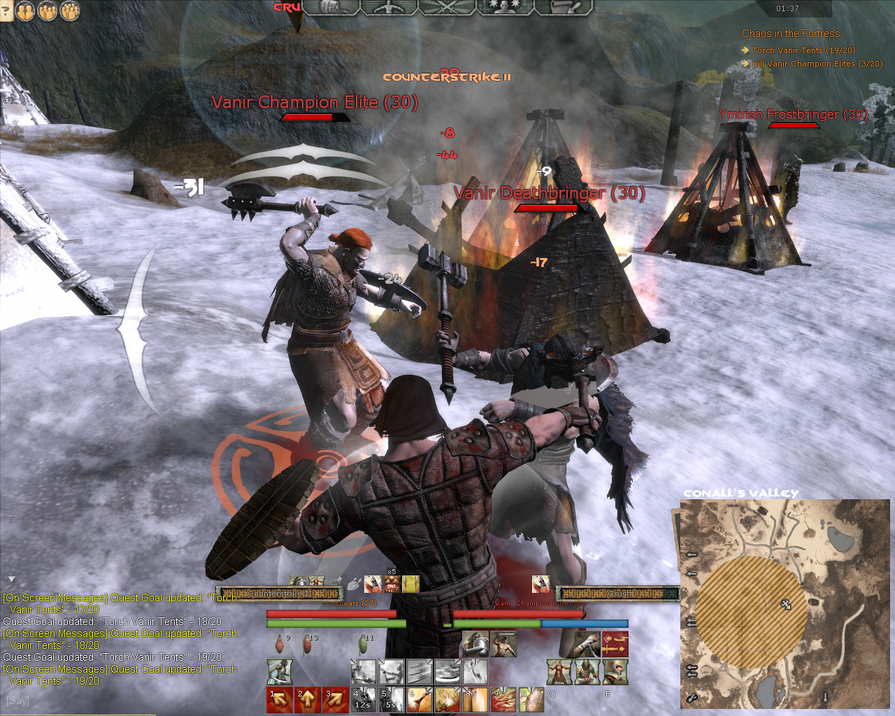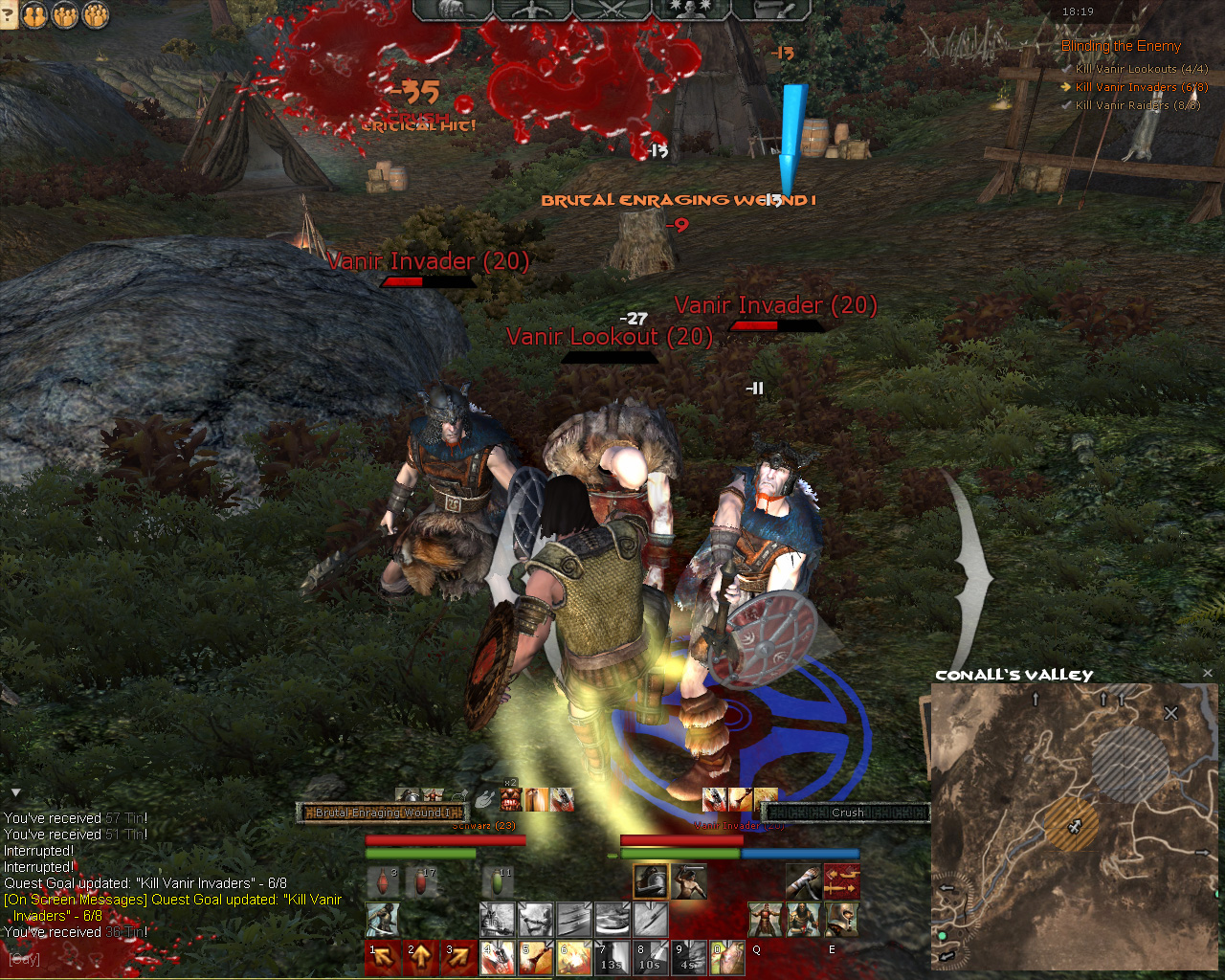 敵はほとんどが赤毛のVanirで,あちこちに野営地があって多数の敵が配備されている。マップもかなり広く,奥の方に行くとソロで倒すのは困難なエリートモンスターがうようよしているところもある。Vanirと戦っているキンメリア人のキャンプもポツリポツリとあり,そういうところでも多くのクエストがもらえるので,とにかくクエストをひたすらこなしてさえいれば,それこそあっという間にレベル20台後半までいけるはずだ。