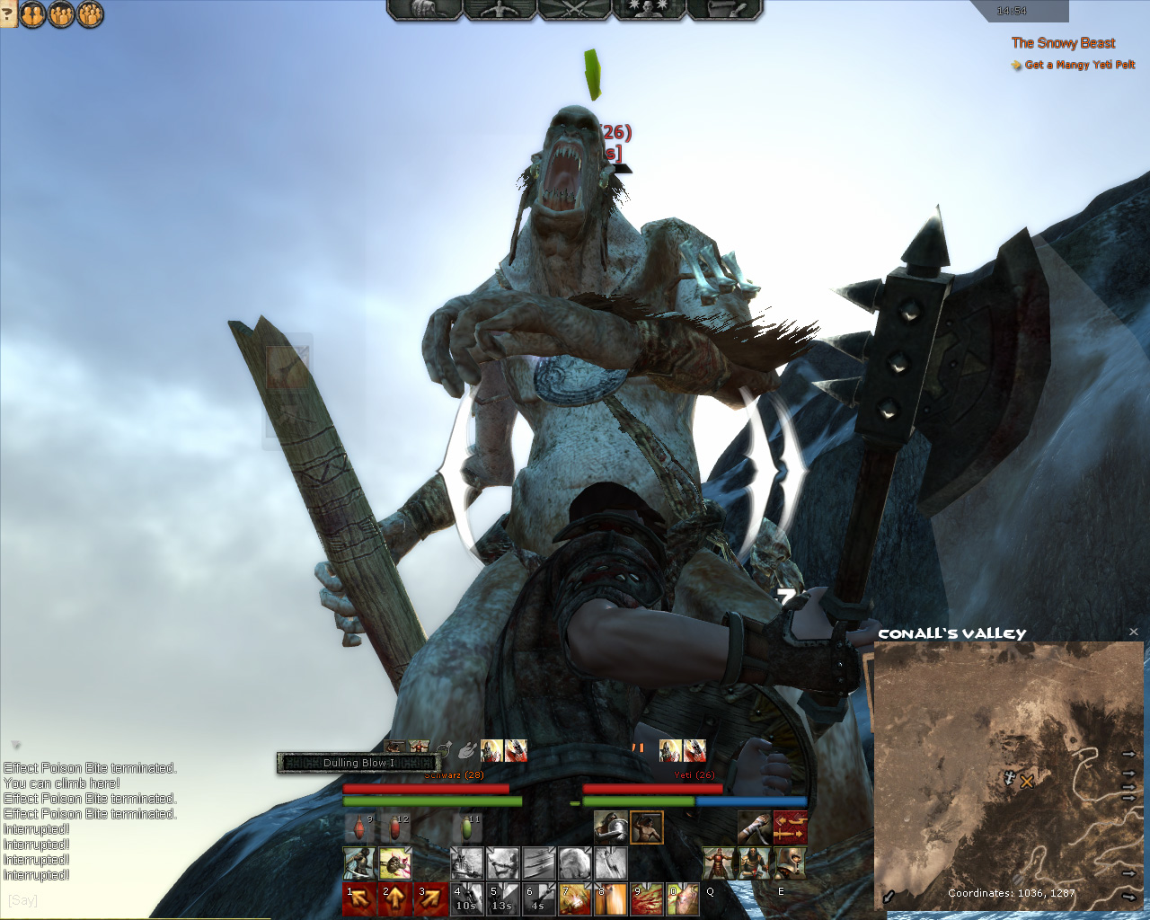 ほかにも,崖をよじ登ってYetiという雪男のようなモンスターを退治するクエストなどもある。崖を登るにはClimbのスキルが120ポイントも必要なため,ポイントが余っていなかったらパスしたほうがよいかもしれない。クモの洞窟の近くには,失った声を探すというクエストもある。声を盗まれたために歌うことができなくなったという男の頼みを聞き,マップを巡ってアイテムを集めてくればよいので,クエスト自体は簡単。その割に,Cloth〜Heavyまでの下半身用防具をもらえるナイスクエストだ。