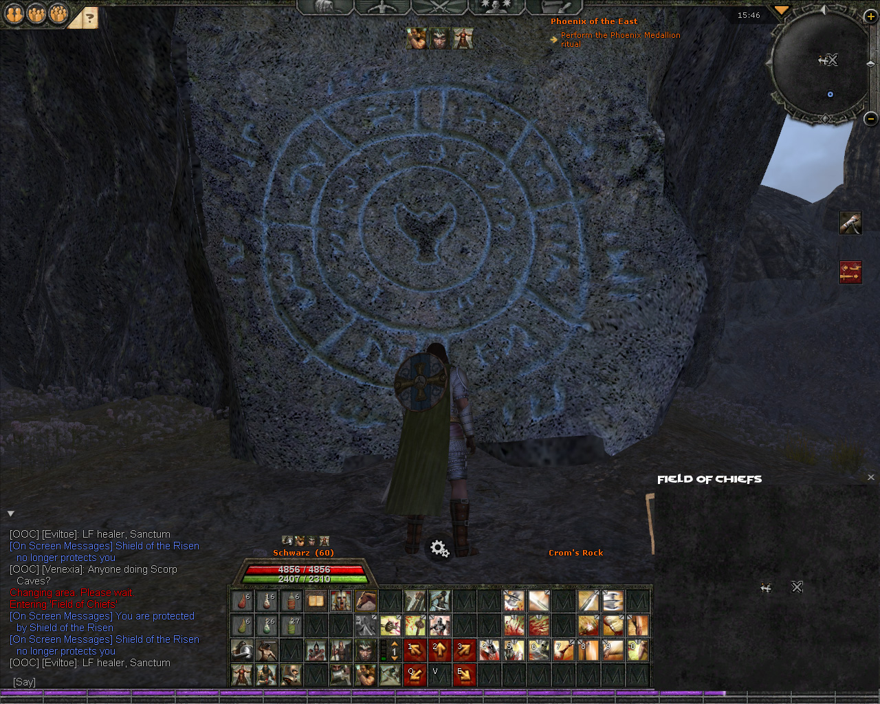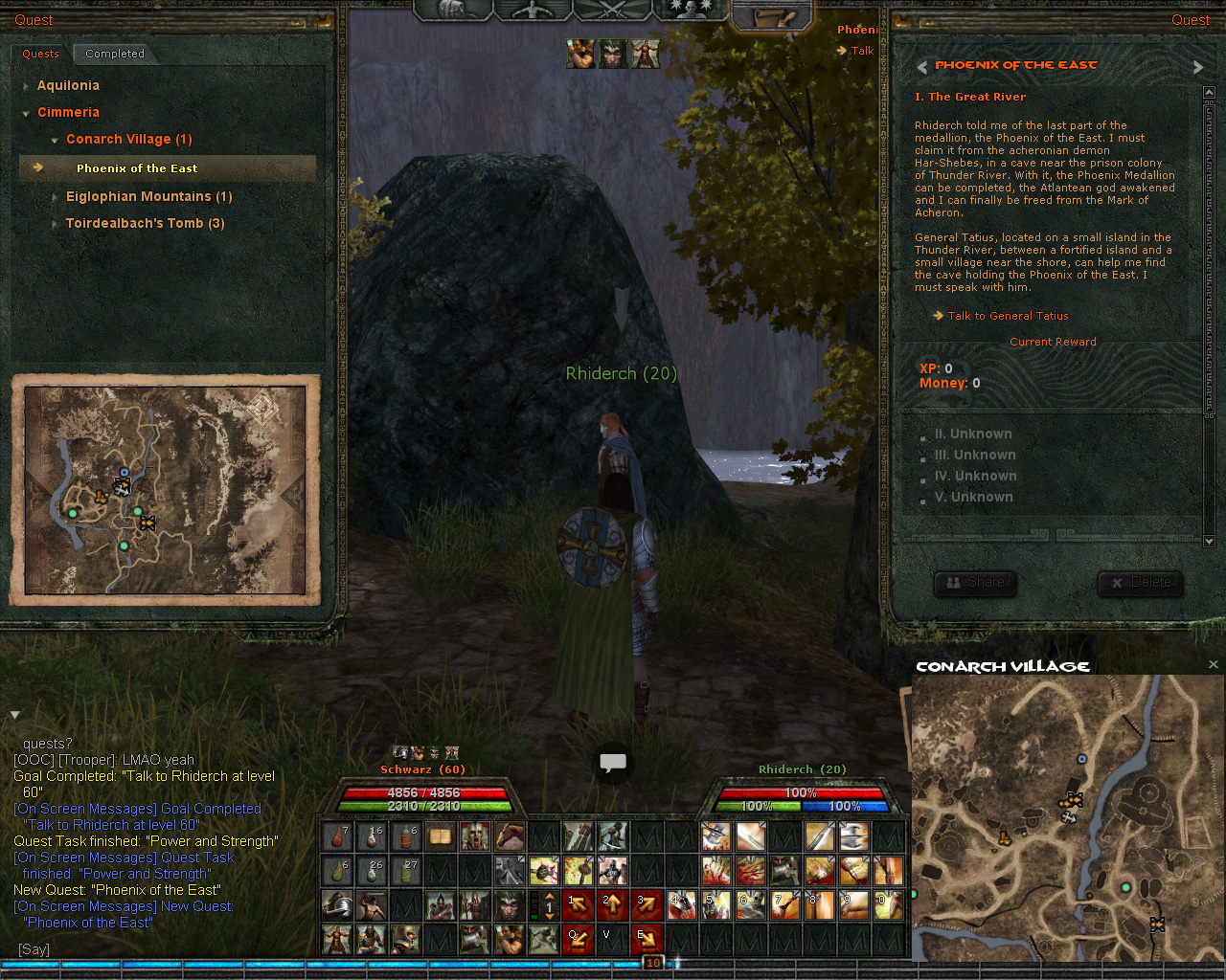 いつものようにキンメリアのRhiderchに会いに行き,レベル60のDestiny Quest「Phoenix of the East」をもらった。Rhiderchによれば,最後のメダリオンPhoenix of the Eastは,Thunder Riverの洞窟の中にあるらしい。詳しい場所はGeneral Tatiusに聞けというので,なにはともあれThunder Riverへ向かうことに。