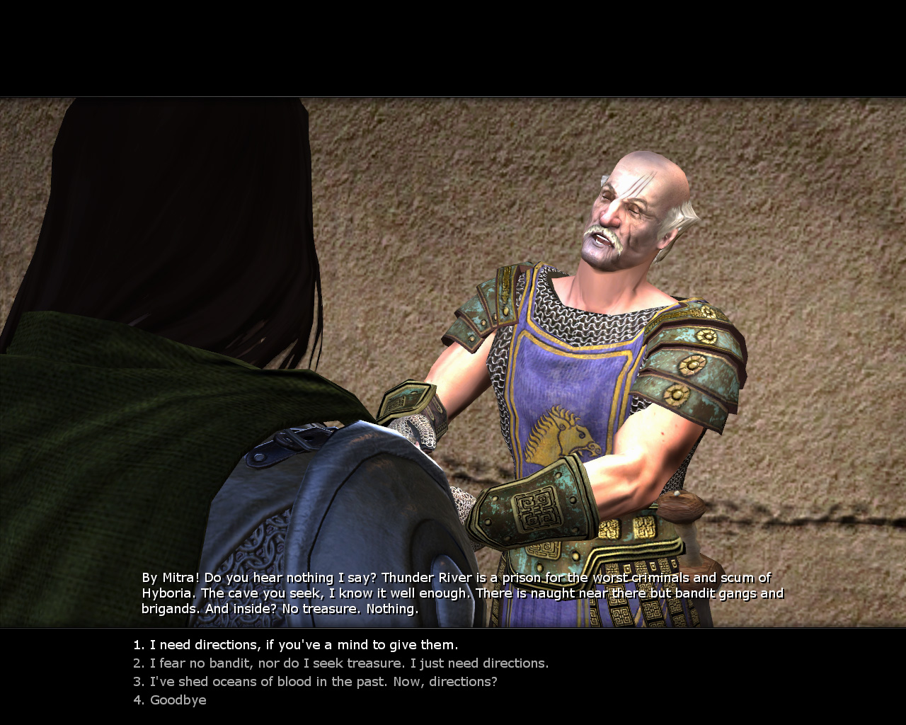 ここで,Thoth-Amonが暗黒神Grim Grey Godを復活させ,自らの帝国を興そうとしていることを報告すると,コナンからはKheshattaへ行ってKalanthesに会い,彼の指示を受けろという命を受ける。コナンへの忠誠を誓ったシュワちゃんは,いまやコナンの信頼を受けた仲間の一人となった。Thoth-Amonを倒すことは,自分を奴隷にしようとしていたヤツへの復讐でもあり,またコナンの王国を守ることにもなるのだ。そう考えると,これからの冒険にも,いっそうやる気が湧いてくるというものだ。
