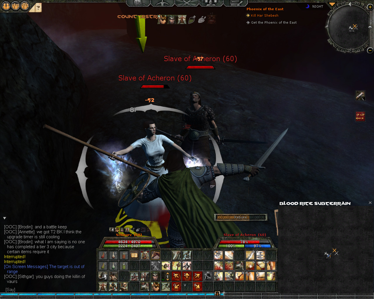 洞窟の中には,例によってSlave of Acheronという奴隷と,Blood RizardやAncient Ghoulなどというクリーチャーがうろついていた。レベルはシュワちゃんと同じ60だが,プレートアーマーで完全武装したシュワちゃんの敵ではない。1体ずつチマチマと倒していても時間の無駄なので,2〜3体をまとめて倒しつつ奥へと進んでいく。