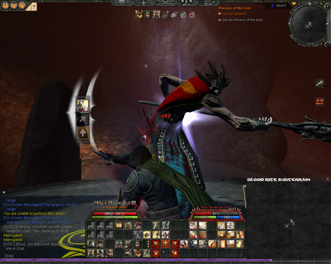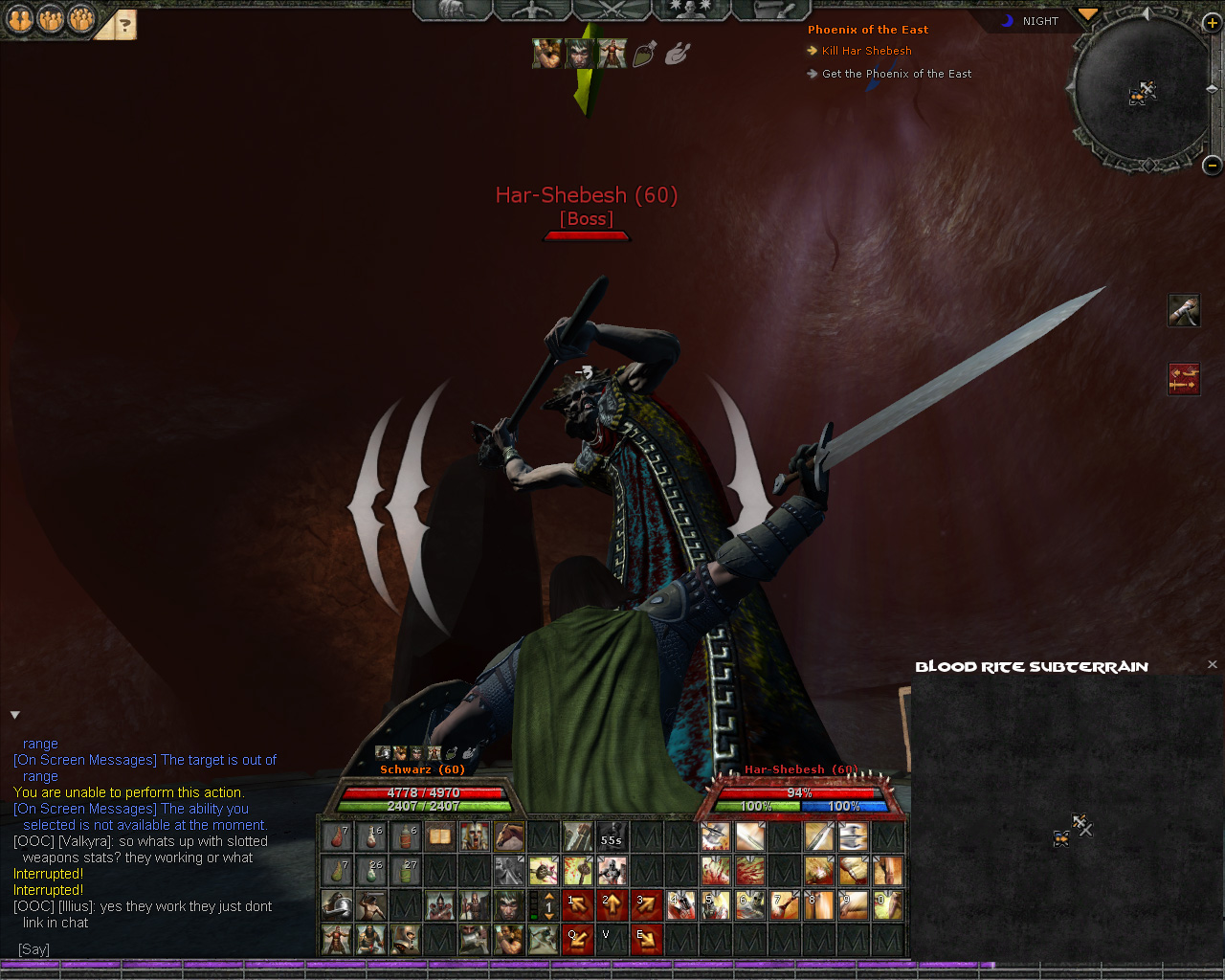 洞窟の最奥部には,Phoenix of the Eastと,それを守護する洞窟のボスHar-Shebeshが待ち受けていた。Har-Shebeshの周りには,Lich Apprenticeというザコが5〜6体取り巻いているので,まずはこのザコから先に仕留めていくことにする。Lichというので,てっきり魔法を使ってくるのかと思いきや,手に持った杖で殴ってくるという直接攻撃系だったので,あっさりと倒した。シュワちゃんは剣&盾のほかに,敵を遠距離から引き寄せる(プルなどと呼ばれる戦法だ)ためのクロスボウを装備しているので,こういうときは便利だ。