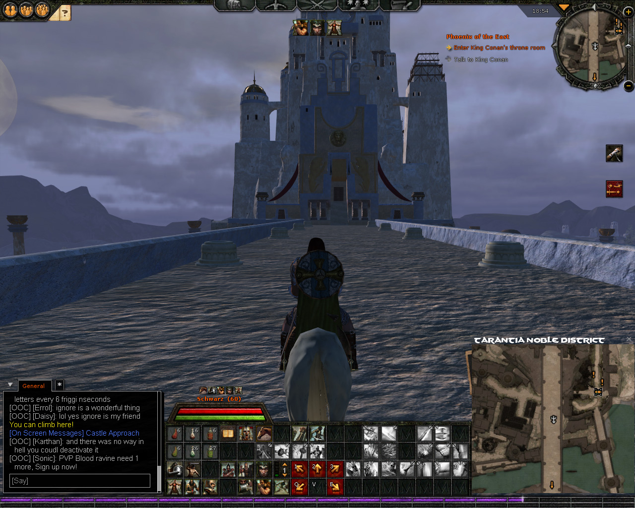 Phoenix MedallionをCrom's Rockに戻せば,いよいよOld Tarantiaにある城で,コナン王との対面だ。このときを夢見て頑張ってきたかと思うと,心は逸るし気は焦る。コナンの城には,Old TarantiaのNoble Districtから行けるようになっている。ここはレベル40くらいのときに,たっぷりとお世話になった懐かしい場所だ。