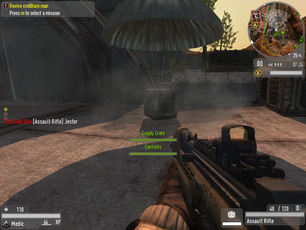瀕死の味方は電気ショック(Defibrillator)を使用して蘇生させる(電気ショックで傷ついた味方が生き返るというのもなんだか妙だが……)。さらに補給物資(Supply Crate)の投下要請が可能。Supply Crateで味方がヘルスと弾薬を回復できるので,戦闘の様子を見つつ適切な場所を選んでSupply Crateを配置しよう。へたな場所に置くとSupply Crateに集まる味方が狙い撃ちされるので注意が必要だ。