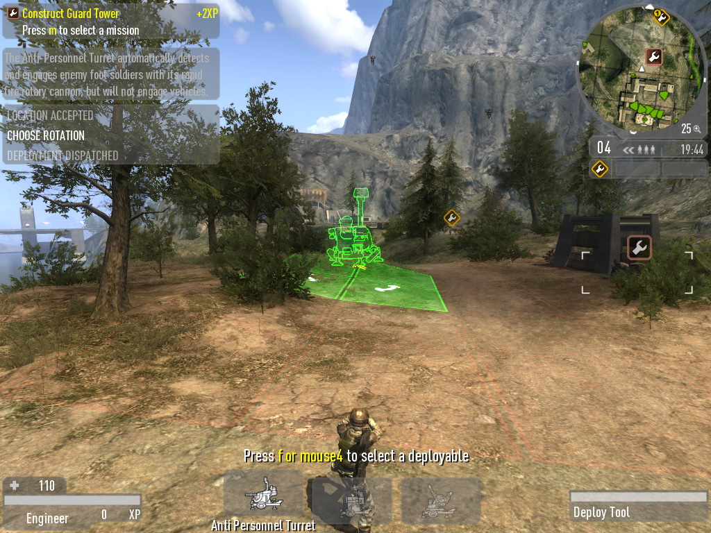 戦闘で重要なのが対ビークル兵器(Anti-Vehicle Turret),対人兵器(Anti-Personnel Turret),対砲撃兵器(Artillery Interceptor Turret)の設置である。これらは非常に効果が高いので,要所に設置すると戦闘を有利に進められる。ただし,一人のEngineerが置ける設置兵器は一度に一基までだ。