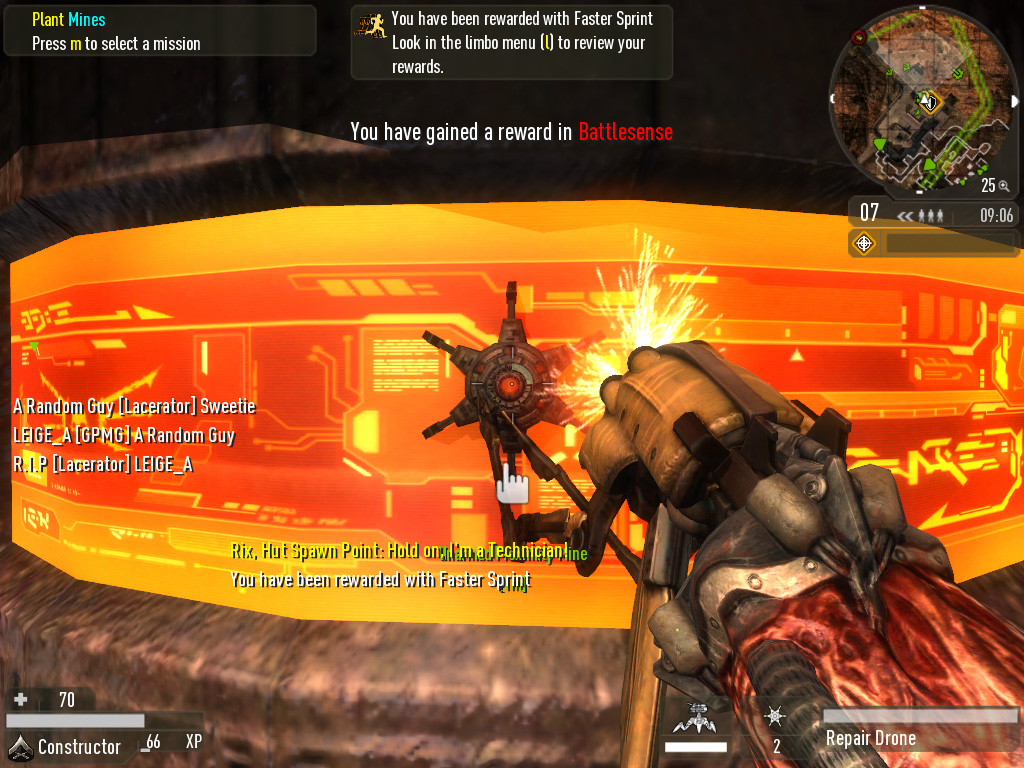 GDFのEngineerに相当するクラスだ。基本はEngineerと同様だが,Constructorの特殊技能の一つに,Lv.1で使えるFlying Repair Droneがある。リペアツールが宙を飛び,勝手に修理してくれるというもので,修理しつつ敵を攻撃できるため非常に便利だ。ただし,Flying Repair Drone使用中はリペアツールがなくなり,地雷の設置もできなくなることには注意が必要。