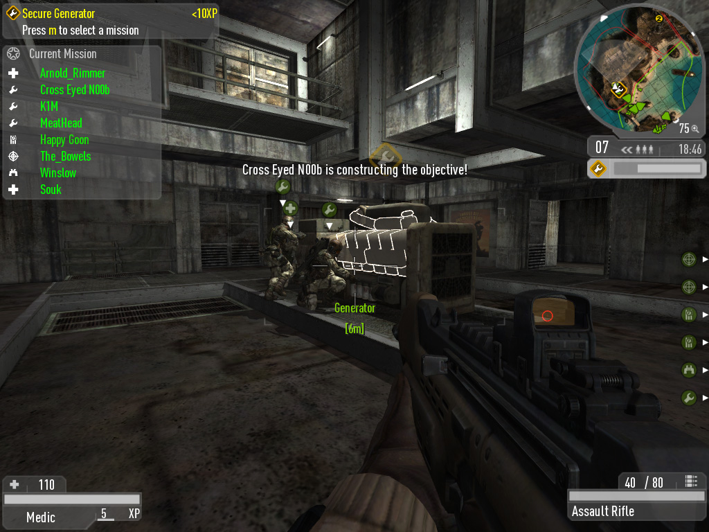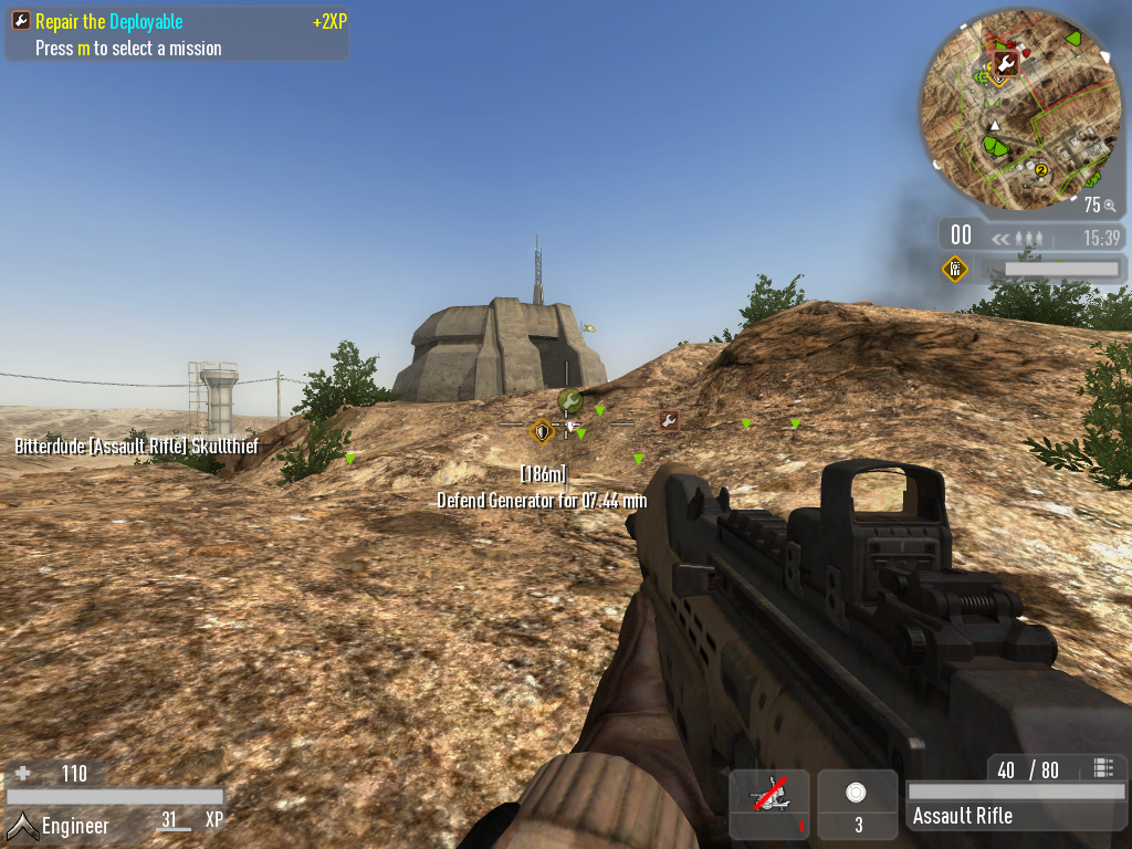 Objectiveの上には作業するクラスのアイコンが表示されているので,どれが今の課題になっているかは(近づけば)すぐに分かる。また,画面左上にはObjectiveの達成度(例えば,Engineer/Constructorなら修理/建設の進捗度)がグラフで表示される。このグラフは作業中の隊員だけでなく,チームのメンバーすべてに表示されているので,今のObjectiveがどうなっているのか(作業に着手したか,またどのくらい進んでいるかなど)全員が確認できるワケだ。