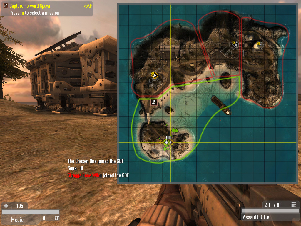 というわけで,マップについて。ご覧のようにETQWでは画面上に今の戦況やObjectiveの状態,そしてプレイヤーがやるべきミッションといった重要な情報がうるさいほど表示されている。そのアイコンやデータを理解すれば「今,何をすればいいのか?」という迷いがなくなるのは当然だし,さらにその情報を元に戦えば戦場で大活躍できること間違いナシなのである。これ,本当。