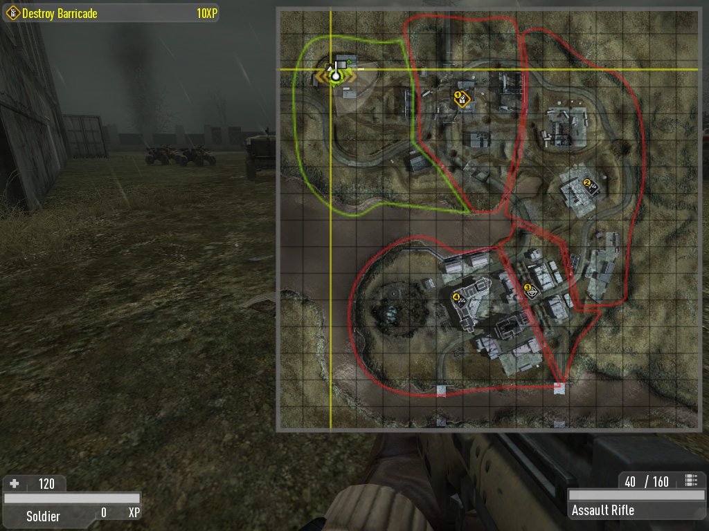 攻撃側に比べると守備側の行動はシンプルで,早い話が敵のObjectiveの達成を邪魔すれば良いだけである。したがってマップもシンプルで,守るべきオブジェクトに丸数字と守備アイコン(白黒の若葉マークのような形のアイコン)が表示されるだけとなる。