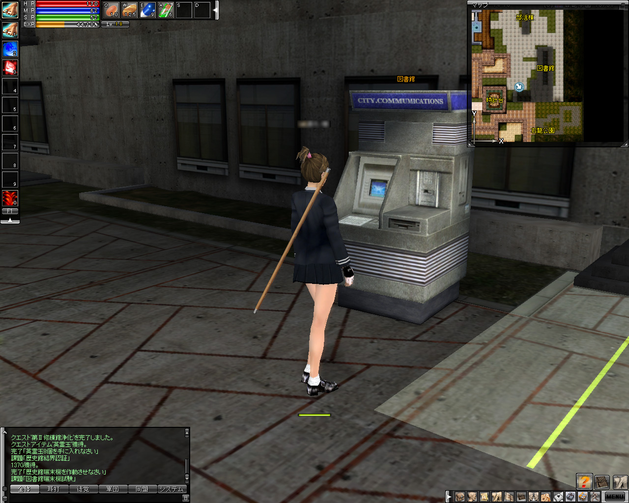 一方,試験で間違えてしまうと,再試験を受けるために学生寮の掃除をするハメに。MMORPGとは思えないショットである