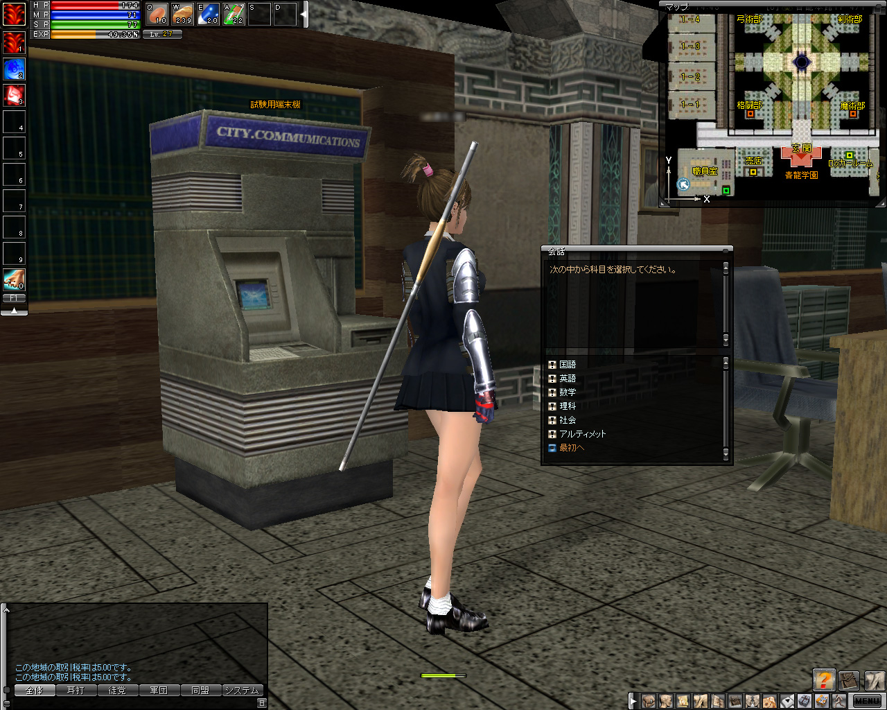レベルが一定に達すると端末で試験が受けられる。選択式のクイズで,5問正解すると経験値やスキルポイントがもらえる