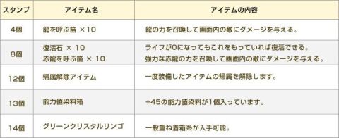 (イベント期間中に14個のスタンプを獲得した場合には、4/8/12/13/14個の全てのスタンプの景品アイテムがプレゼントされます。)