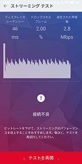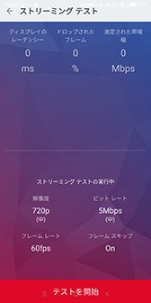 画質に関わる設定を行うときに役に立ちそうな機能もある。ゲーム エクスプローラーの設定メニュー最下段にある「ストリーミングをテスト」という機能がそれだ。これをタップすると,「ストリーミング テスト」という画面に切り替わり,通信帯域幅やフレームのドロップ率,表示遅延を示す「ディスプレイのレーテンシー」を計測して,結果を確認できるのだ。