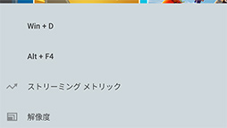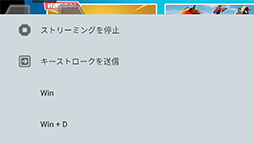 いちばん右側のメニューアイコンは,ストリーミングの設定メニューである。解像度やビットレートをここから切り替えられるほか,ストリーミングの停止や,[Windows]キーや[Windows]+[D]キー,[Alt]+[F4]キーといった特別なキー入力を送信するといった操作を行うときに使う。