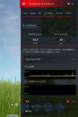 Radeon Overlayにおける新機能でも目玉と言えるのが「Game Advisor」(ゲーム アドバイザー)だ。フレームレートや1フレームの描画に要した時間といった情報を計測して,ユーザーに提示する機能である。