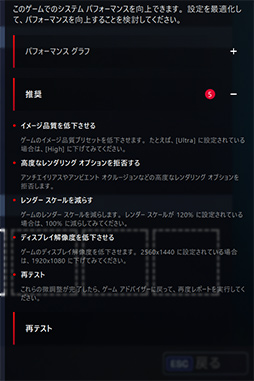 また,プレイ中のゲームに対してPCの性能が不足気味の場合は,「推奨」という項目に数字の入った赤いマークが現れるはずだ。ここで推奨を開くと,ゲームの画質設定をどう変えるべきかというアドバイスが得られる。説明は分かりやすい言葉で書かれているので,ゲームの快適さを向上させたいという人には,なかなか参考になるのではないだろうか。