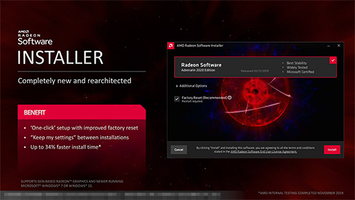 まずAdrenalin 2020では,インストーラを新しいものに更新した。ワンクリックでセットアップが行えて,インストール時間は34%以上の短縮を実現しているという。もちろん,以前の設定を維持したまま上書きインストールが可能だ。