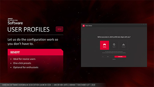 Adrenalin 2020の機能は非常に多岐にわたるため,その設定を簡略化するため,AMDは新たに「Gaming」「eSports」「Standard」というユーザープロファイルを用意した。ユーザーが,任意のプロファイルを選択することで,簡単に設定を適用することが可能というわけだ。