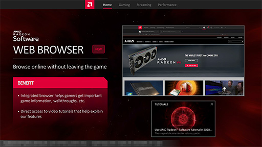 Radeon Software AppにWebブラウザ機能を実装。これにより,ゲームを中断してほかのWebブラウザを起動することなく,ゲームをプレイしながら攻略情報を検索したり,動画を視聴したりすることが可能になる。