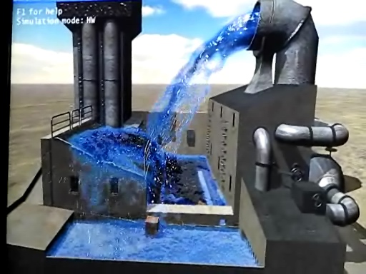 次に流体のデモである。AGEIA PhisXの頃から流体デモは盛んに行われていたのだが,いま一つ自然な水とは言い難い表現になっていたのが実情であった。ただムービーを見てもらえれば分かるが,GPU PhysXのパワーを使えば,動き自体はかなり自然になっていることが確認できる。フレームレートはさらに倍くらいほしい感じではあるが,クオリティはずいぶん上がっている印象だ。