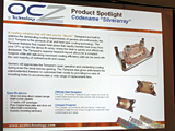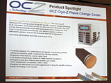 なおDemo Showcaseに先立って行われたセッションでは,“本業”の新製品についても追加の説明がなされた。水冷&空冷両用の“PC2-9200”モジュール「OCZ DDR2 PC2-9200 FlexXLC Edition」の冷却構造や,世界最小を謳う小型サイズの1000W電源ユニット「OCZ ProXStream 1000W PowerSupply」,銀の棒入り水枕「Silver Array」(開発コードネーム),そして新製品となるメモリ冷却用ファン「OCZ XTC Memory Cooler」,オーバークロック専用冷却ユニット「OCZ Cryo-Z Phase Change Cooler」の概要が,以下のとおりスライドベースで語られている。