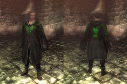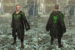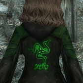 ★Razerクローク(※「★」まで含んでアイテム名だ)を着せた様子。表側はRazerのコーポレートカラーである“毒による状態異常色”(venomous green color)をあしらった中世風の模様,肩と背中にはRazerロゴがあしらわれる。ちょっと驚くくらい違和感が少ないのはすごい