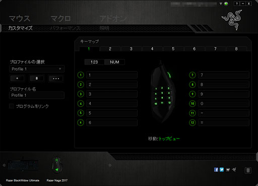のどちらかとして利用可能。またRazer Naga Hexでも,メインキーボード最上段の[1]〜[6]キー,もしくは10キー部の[1]〜[6]キーとして利用できるが,いずれの場合でも,専用の設定ツール「