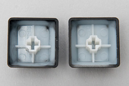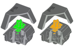 以上,BlackWidow Ultimate 2014とBlackWidow Ultimate 2014 Stealthは,2012モデルから,キースイッチを交換しただけの製品と述べても間違いではないわけだが,では,唯一にして最大の特徴である,Razer独自の緑軸スイッチとオレンジ軸スイッチとは,いったいどんなものなのだろうか。キートップを外して,スイッチに寄って撮影したのが下の写真だ。