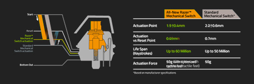 Razerの示しているスペック比較だと,明確にCherry MX Brown系なのだが,どちらかといえば「押下圧が一定で,スイッチがオンになる部分に手応えも音もない」タイプであるCherry MX Redに近いキースイッチと言えるのではないかと思う。