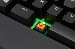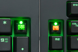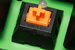 オレンジ軸は,「スイッチがオンになる部分に明確な手応えがなく,クリック音もなく,押下圧は一定」というタイプだ。BlackWidow Ultimate 2013 Stealthで採用されていたCherry MX Brownだと,「押下圧は一定でクリック音はないが,スイッチがオンになる部分にわずかな手応えがある」タイプだったので,特性は若干異なる。