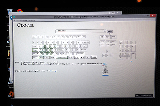 オンラインのキーチェッカーでNキーロールオーバーを確認してみた。ここで掲載したのは何パターンかテストしてみたうちの1つだが,両手を使ってキーを一度に押下しても,すべて認識されている