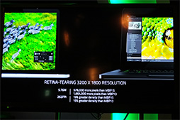 | とくに重点を置いてアピールされたのが液晶パネルだ。Retinaディスプレイ搭載のMacBook Proよりも高解像度で高DPI。それに加えて,コントラスト比や輝度も高い。数値は公開されなかったが,応答速度にも優れるという。 |