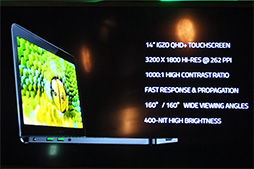 2など,ノートPC用としては優れたスペックを備える液晶パネルを採用しているのだという。そのうえ10点マルチタッチにも対応していると,Sather氏は誇らしげにアピールしていた。