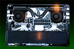 液晶パネルに続いて取り上げられたのが,高いスペックのコンポーネントを詰め込んだ薄型ボディだ。薄い筐体に,ノートPC用としてはパワフルなCPUとGPUを搭載して高い性能を発揮させるのは,「かなりのチャレンジだった」とSather氏は振り返っていた。独自に開発したという放熱機構は,ボディ内に2基の冷却ファンを搭載し,熱を持った空気を底面側に排気するという構造を採用しているそうだ。