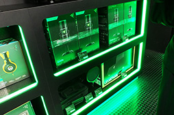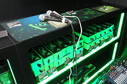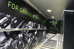地下1階に通じる階段も,RAZERZONEに合わせて装飾されていた(左)。地下1階は,全体がRAZERZONEとなっている(右)
