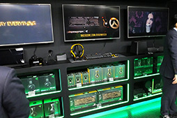 入り口を入ってすぐ左手の壁には,「Overwatch」コラボモデルのキーボードやヘッドセット,サウンドバー製品「Razer Leviathan」が展示されているのに加えて,オープンソースのVR対応ヘッドマウントディスプレイ規格「OSVR」(Open Source Virtual Reality)に対応する「HDK2」の試用機もあった(左)。ほかの店ではあまり見かけない,単体マイク製品の「Razer Seirēn」とそのオプションといった,珍しい製品も販売されている(右)