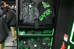 入り口右手にあるレジカウンターの隣には,Razer製キーボードがずらりと並んでいる(左)。その奥には,RazerブランドのパーカーやTシャツ,バックパックといったレアものグッズも展示されていた(右)