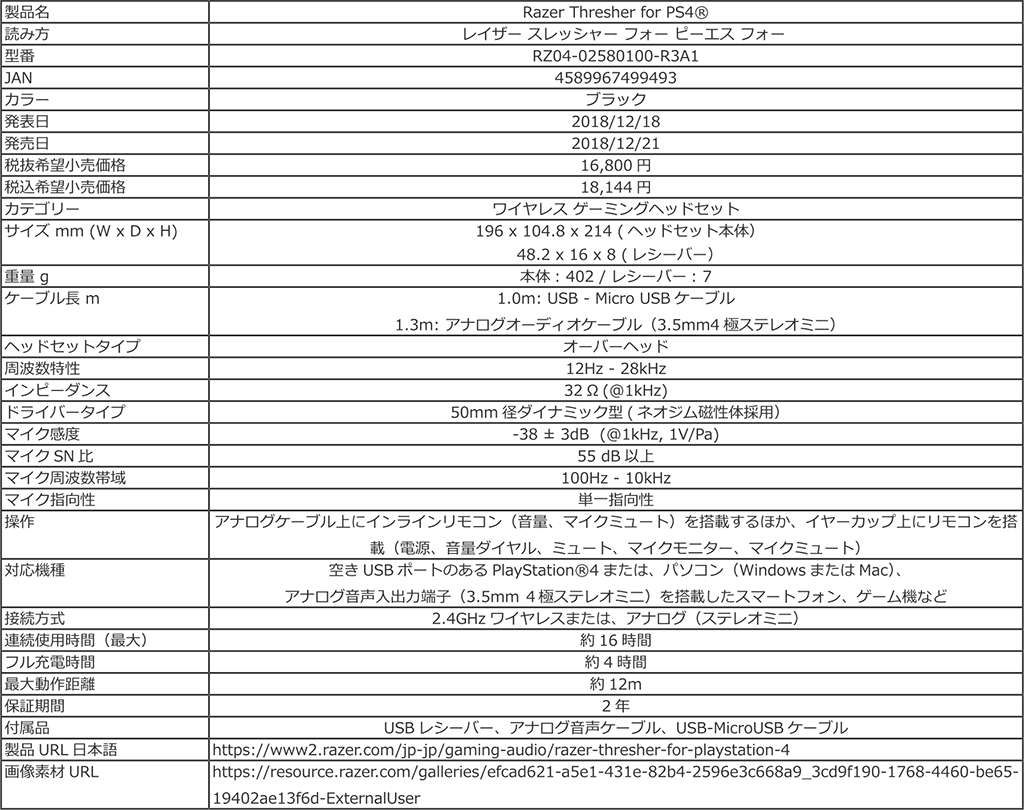 ワイヤレスとワイヤード両対応の2chステレオヘッドセット「Razer Thresher for PS4」が12月21日に国内発売