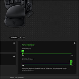 さて,そんなTartarusシリーズの最新モデルであるTartarus Proは,冒頭でも触れたとおり,Analog Optical Switchの採用によるアクチュエーションポイントのカスタマイズ機能が最大の特徴である。しかも,単にアクチュエーションポイントの深さを変えるだけでなく,押し込み具合によって異なる操作,たとえば軽く押せばキャラクターが歩き,強く押し込めば走るといった使い分けが可能になるという。
