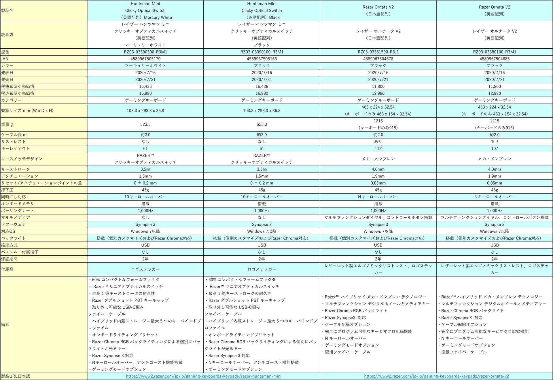 Razer,光学式キースイッチ採用の小型キーボード「Huntsman Mini」を国内発売。メンブレンタイプのフルキーボード「Ornate V2」も投入