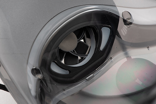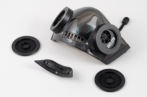 顔に触れる部品を外すと,吸気孔内側の小型ファンとLED(ファンの左右に見える灰色の部分)が見える
