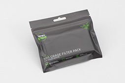 吸気孔にフィルターを乗せた状態(左)。右は交換用フィルターセット「N95 Grade Filter Pack」。10セット分入っているので,ほぼ1か月分だ