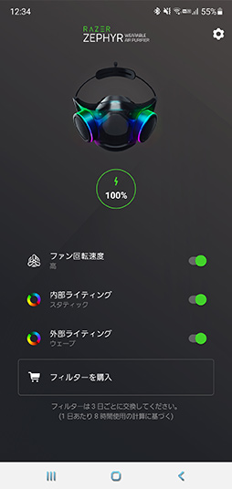 Razer Zephyr」でカスタマイズ可能だ。吸気孔を囲むリング状LEDと,内側のLEDをそれぞれ個別に設定できる。また,バッテリー残量もアプリで確認できる。