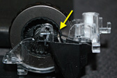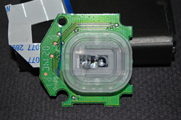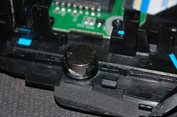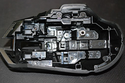 ![]() 上面カバー,メインボタンのスイッチを押下する部分には,G500sから引き続き,シリコンシートが貼られていた。筐体側の作りが相当に複雑なのも見て取れよう |